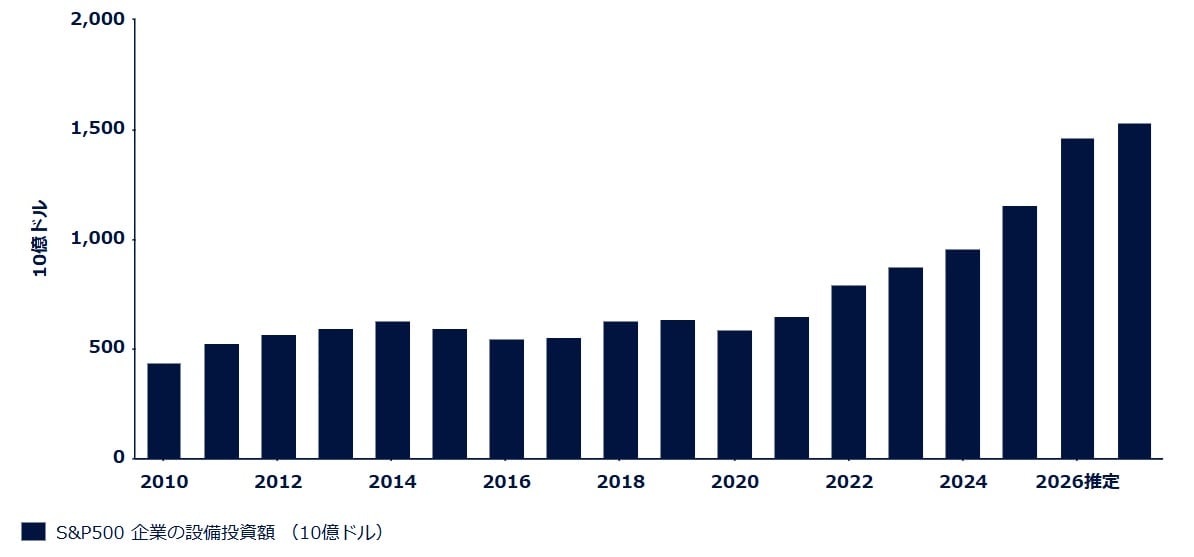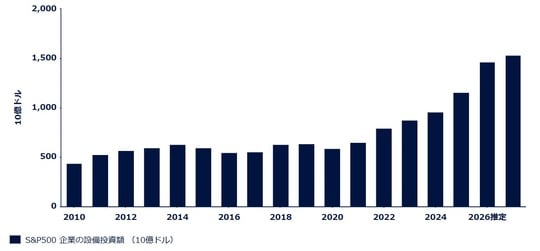 さらに、S&P500企業の設備投資は2024年の9,558億ドルから2027年には1兆5,400億ドル超へ増加すると予想されています(図表2)。