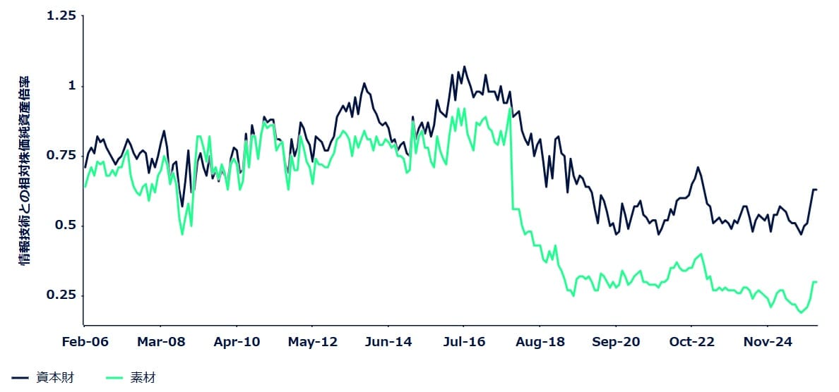 素材セクターは最もアンダーウェイトされているセクターの一つであり、資本財セクターに対する投資家のポジションもマーケットニュートラルに近い状態にあります※8。両セクターの株価純資産倍率(PBR)は、アセットライト(資産軽量)な情報技術セクターに対して大幅なディスカウントで推移し続けており(図表3)、投資家が実物資産の価値を再評価する中で、バリュエーションが収束する余地が残っています。