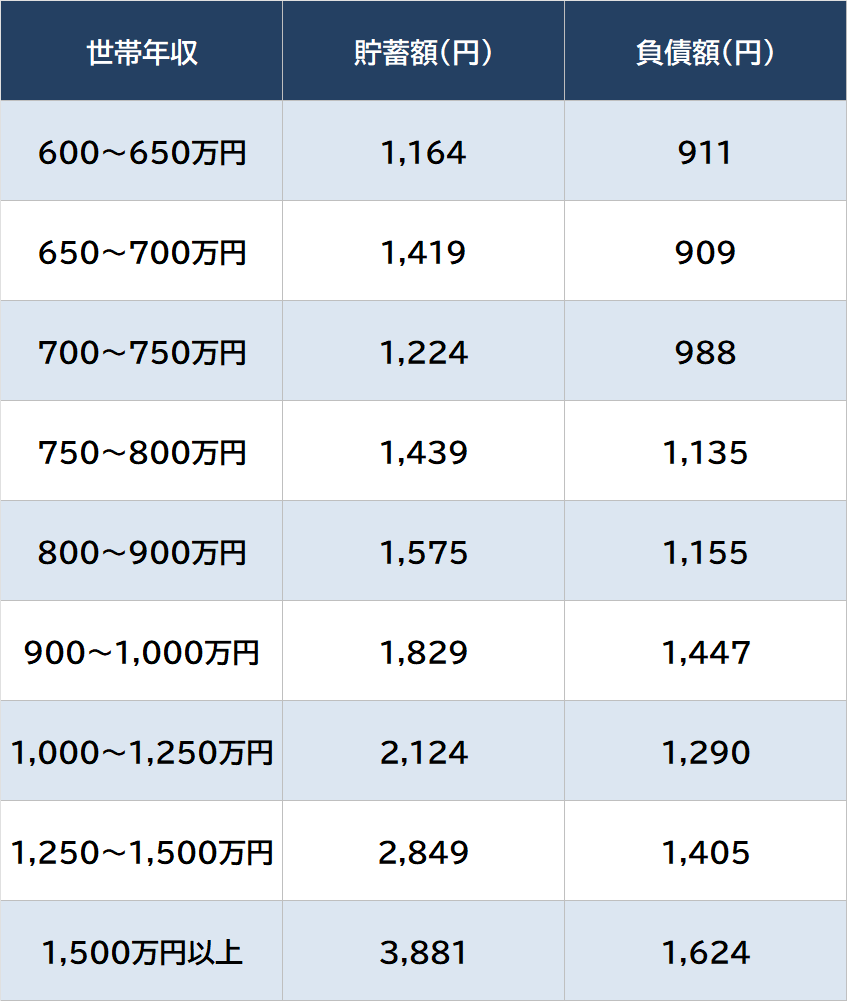 世帯年収600万円台~1,500万円以上の平均貯蓄額・負債額