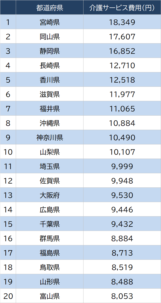 エトセトラ 統計 シェア Tweet [連載] 統計から紐解く日本の実情…統計・調査・ランキング資料 【ランキング】47都道府県「介護費用」…〈家計調査 家計収支編 2025年平均〉 SGO編集部 2026.4.14 統計 調査 【ランキング】47都道府県「介護費用」ランキング1~20位 総務省『家計調査(家計収支編)2025年平均』における「介護サービス費用」の支出データを基にしています。なお、本調査は市区町村単位で実施されているため、都道府県別の値ではなく、各県庁所在地の数値である点にご留意ください。
