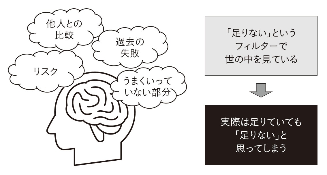 一度このフィルターができてしまうと、たとえ客観的に見て豊かな状況でも、脳は「足りない証拠」ばかりを探し出して、あなたに「やっぱり足りない」と教えてしまうのです。