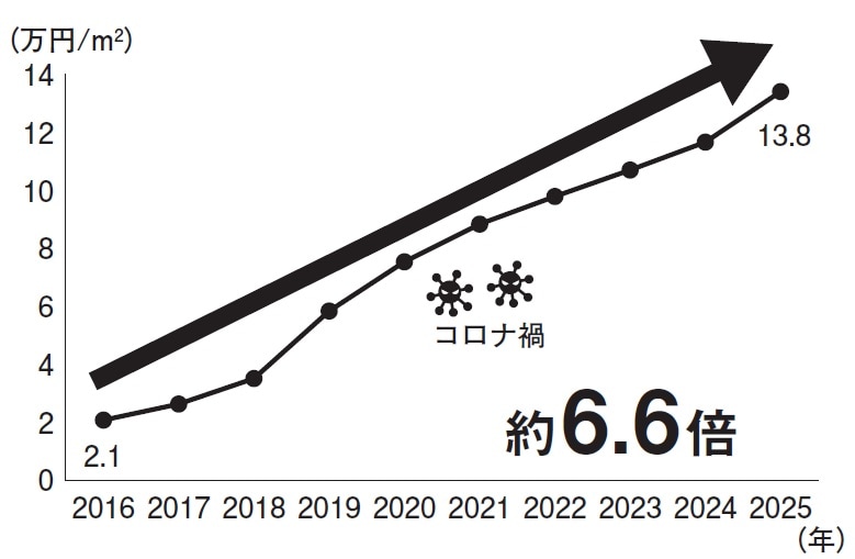 2016年の倶知安町字樺山の基準地価は2.1万円/㎡だったのが、2025年には同13.8万円/㎡となっており、コロナ禍期も含め過去10年間一貫して上昇し、約6.6倍にまで上昇しているのだ(図表1‒2)。