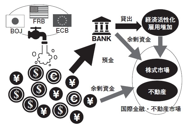 各国の中央銀行からマネーが際限なく供給されているなか、水の流れと同じように、おカネは必ずどこかに流れ着く。本来、金融緩和は、大量に供給されたおカネが、預金から銀行貸出を通じて企業の設備投資や運転資金に回り、経済や雇用の活性化に繋げるために行っている。