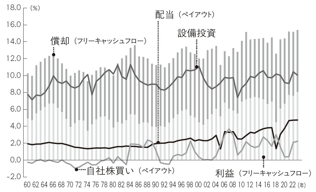 第二の変化は、資金余剰の顕在化である。さきほどの[図表1] に見るように、企業の内部資金(純利益+減価償却費)は、1960年代から1990年代まで、GDPの10~12%で推移していた。