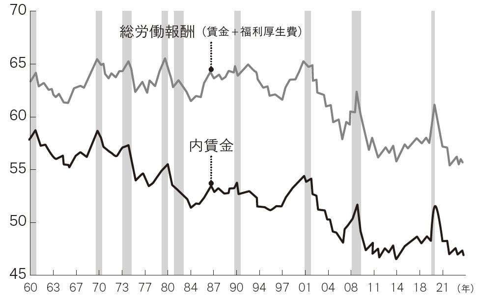それが、2000年代に入ってからは6~8%で推移するようになった。その直接の原因は、[図表2]にもあるように、労働分配率の低下である。過去、福利厚生を含めた労働報酬のGDPに対する比率は、1960年代以降は62~65%の狭い範囲で変動してきたが、2000年からは大きく低下し始め、現在のレベルは57%という歴史的低水準となっている。技術発展とグローバル化(=海外労働の活用)により労働生産性が大きく高まり、企業がビジネスをするために必要な労働投入を節約できるようになったのである。
