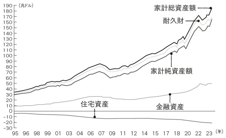 株価など資産価格の上昇により、米国の家計純財産(総資産-債務)は、リーマンショック直後の2009年第1四半期の59兆ドルから、直近2025年第2四半期には176兆ドルと3倍に上昇し、直近の純資産額GDP倍率は5.8倍へと上昇した。これが消費拡大の牽引車になってきたことは明らかである[図表8]。