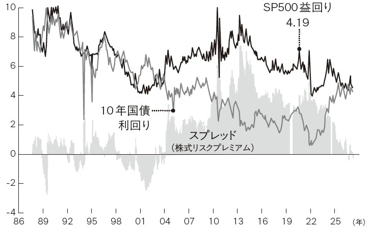 FRBは、自然利子率の近似値である実質FF金利を、大幅なプラスへと引き上げることを余儀なくされている。2022年3月までの0%から5.25%まで、1年余りでFF金利が5%も引き上げられたにもかかわらず、投資意欲がまったく萎えないということが起きている。金利が上がったからといって株価が下落することもなく、史上最高値が更新され続けているのだ。FRBは高値更新する株価と、鎮静化の兆しがまったく不十分なインフレ指標を前に、高金利維持のスタンスを取り始めた。利上げのマイナスは投資家のアニマルスピリットの高まりで、相殺され続けたのである。[図表6]のスプレッドは株式リスクプレミアムであり、アニマルスピリットを示す指標といえる。