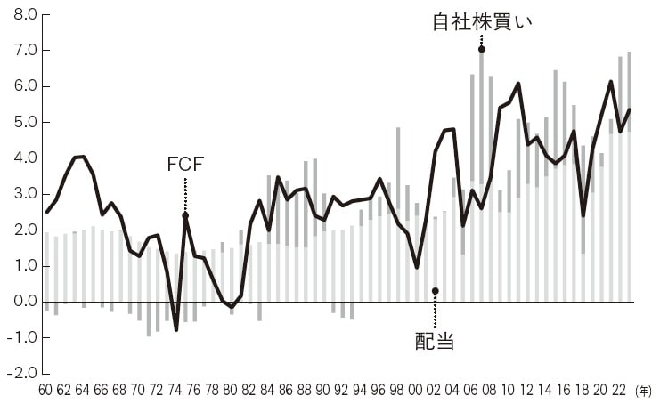 そのチャンネルとして、①株主還元によって企業の余剰が完全に還流したこと、②コロナ対応の大規模財政出動によって有効需要が創造されたこと、の2つが機能したためである。[図表7]は企業部門のフリーキャッシュフローの推移だが、大きく高まったフリーキャッシュフロー以上の配当、自社株買いが実施されている。この企業の大規模なペイアウトが株価を押し上げ、需要創造の源泉になっていることは、先に見たとおりである。