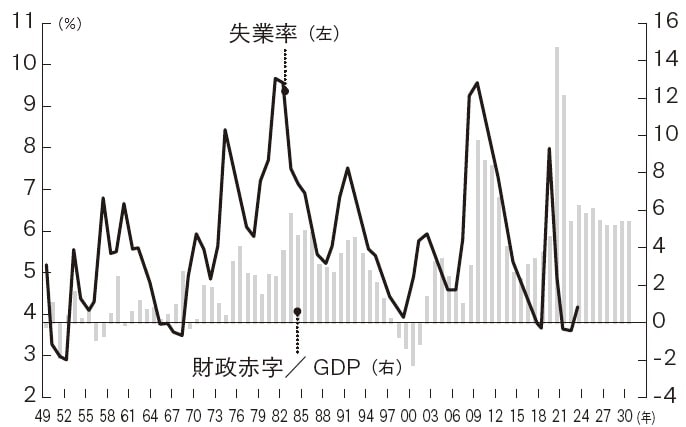 また財政の果たした役割も大きい。[図表9]は米国の失業率と財政赤字の推移を示したものだが、財政の役割が劇的に変わったことが明瞭である。