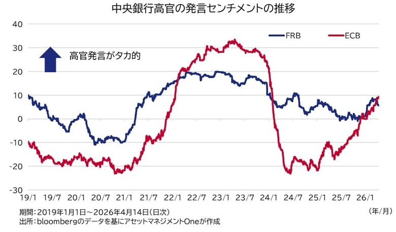 今のところ、中長期のインフレ期待は、市場の予測値も、消費者へのアンケートから確認されるものもあまり大きな変化は見られていません。この点で中央銀行は焦っていない状況であると思われます。実際、FRBとECBの高官らの発言を分析したセンチメント指数からは両中央銀行がタカ化したと言えるものの、2022年からの利上げ局面ほどには上昇しておらず、利上げを強く意識しているわけではありません。
