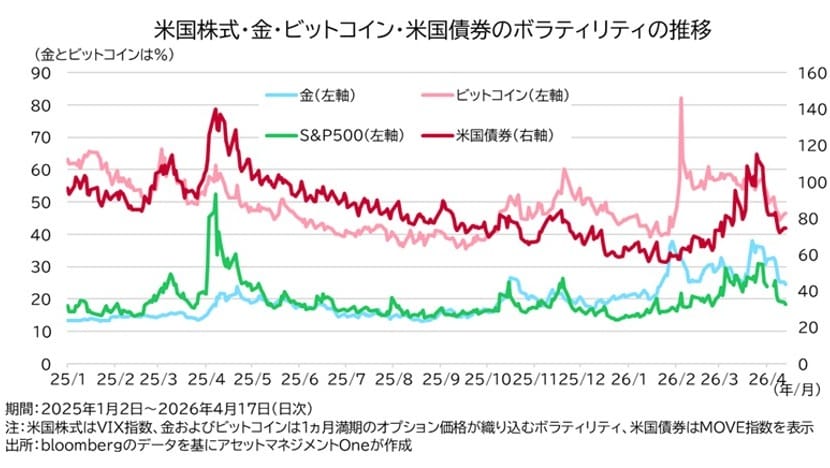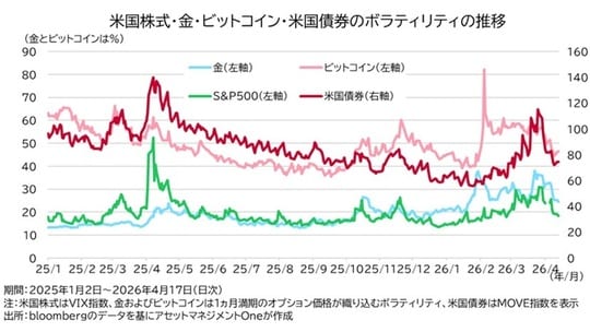 こうした中、市場は停戦期待に対してはリスクオン、停戦が遠のくとリスクオフと両極端に反応しました。米国の主要株価指数(S&P500)は2026年2月末の開戦前の水準まで回復し、日本や欧州の株価も開戦前の水準目前まで戻しています。一方、株価指数そのものの値幅が大きく意外にも思えますが、株・債券共にインプライドボラティリティは低下基調を辿りました。市場が織り込むボラティリティ低下は、市場がトランプ政権の頻繁な政策・発言の変化や、原油の乱高下に慣れてきているということではないかと解釈できます。