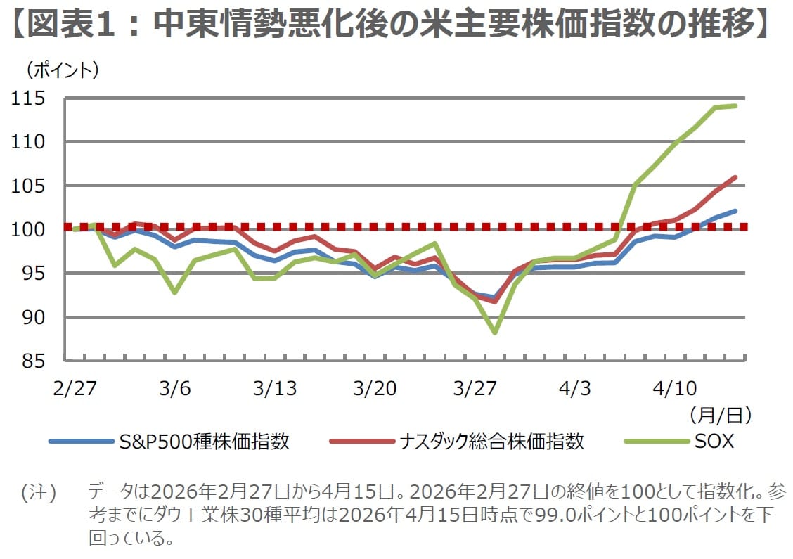 S&P500とナスダックについて、米国とイスラエルによるイラン攻撃前日の2月27日の終値を100として指数化し、4月15日までの推移を示したものが図表1です。両指数とも直近でイラン攻撃後の株価の下落分を埋め戻しました。また、図表1には、主要な半導体関連銘柄で構成するフィラデルフィア半導体株指数(SOX)も掲載していますが、SOXは4月8日に過去最高値をつけて早々に下落分を埋め、足元で大きく上昇しています。