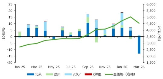 3月初めに中東紛争が勃発して以降、米国の10年物インフレ連動国債(TIPS)の利回りはおおむね30~35bp上昇し、2025年7月以来初めて2.0%の水準を試す展開となりました※13。3月の金価格の調整は、主にFRBの予測の見直しと実質利回りの上昇によるもので、これらの要因がドル高を支えました。