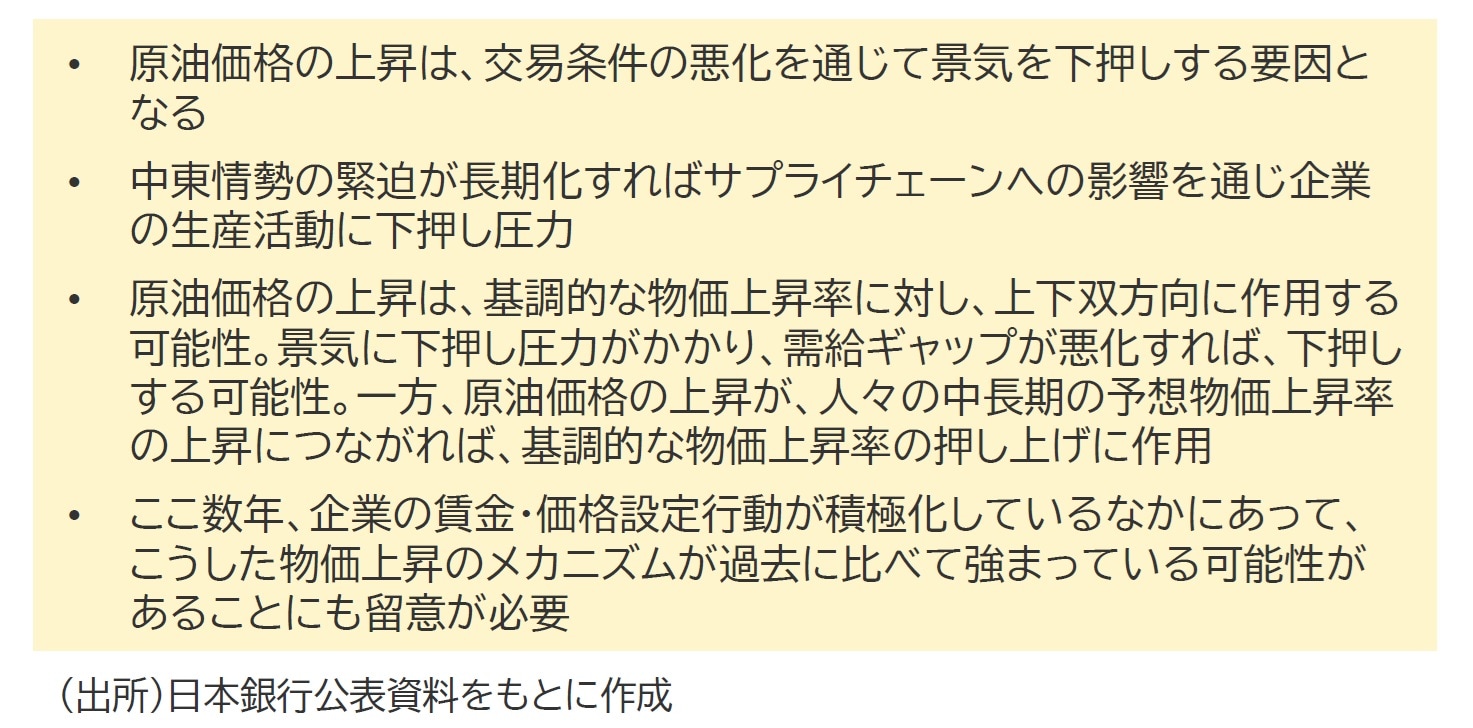 景気への影響について、従来の「原油価格上昇による交易条件の悪化を通じた景気下押し」に加え、「サプライチェーンを通じた企業の生産活動への下押し」という供給制約のリスクが並列して挙げられ、景気下押しへの警戒感が強まったといえます。