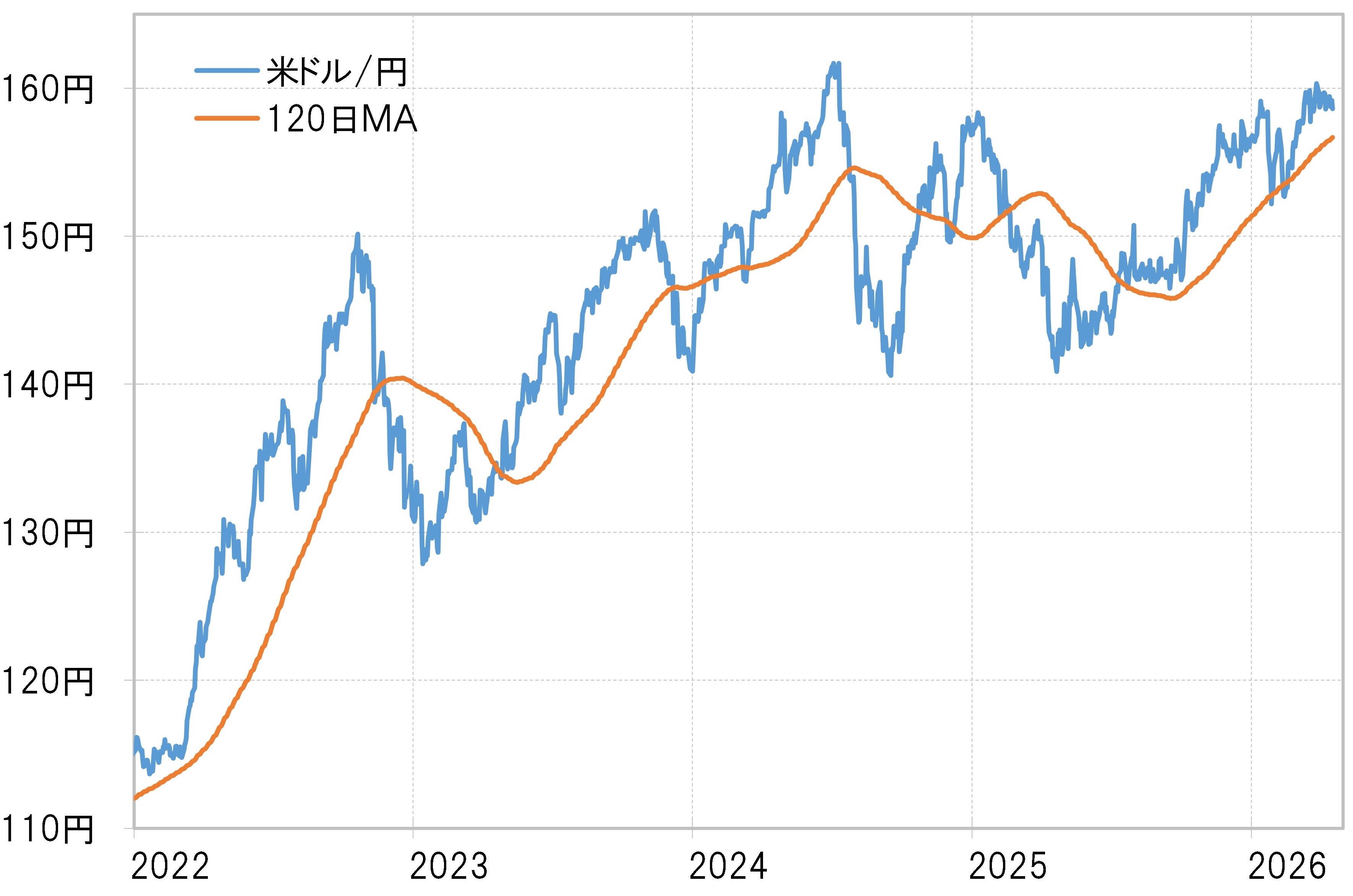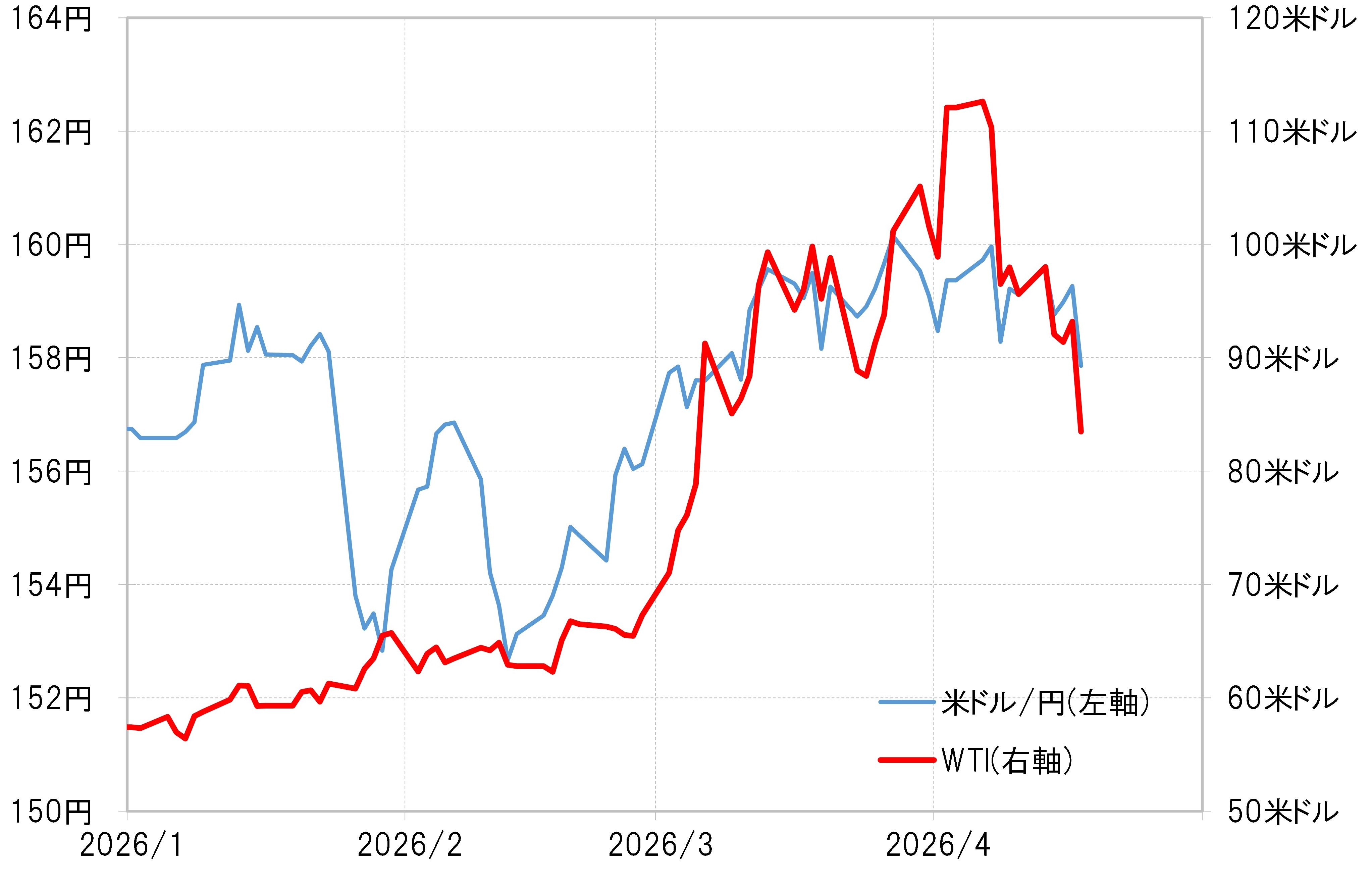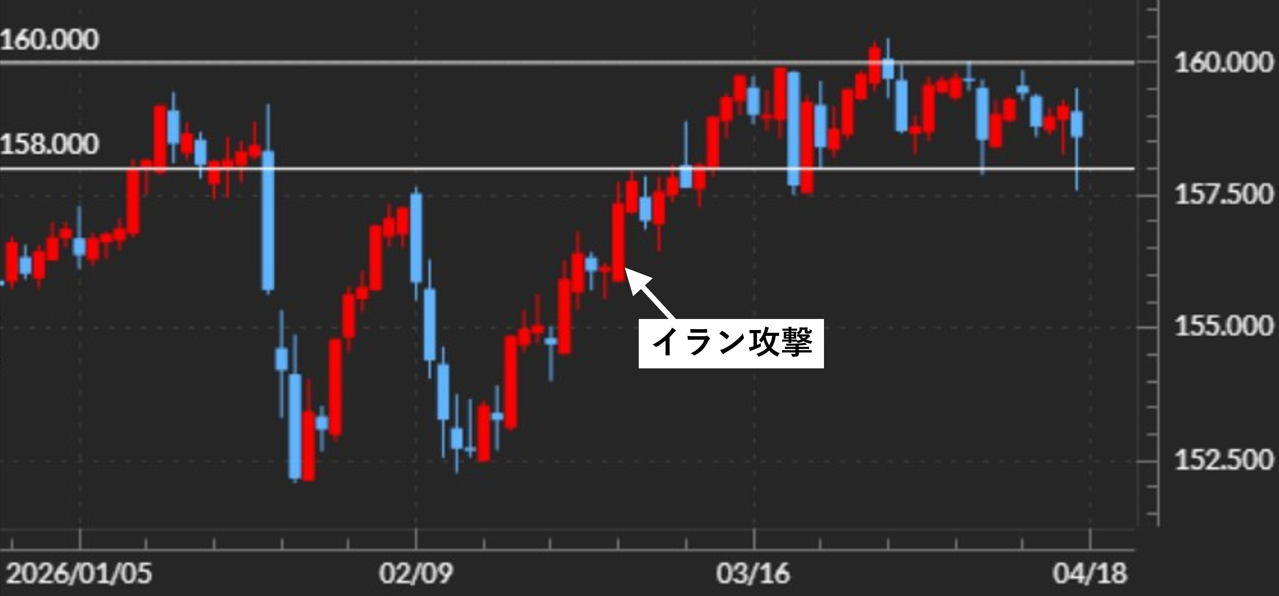 先週は、17日にイランが米国等との停戦中にホルムズ海峡通航を開放するとしたことを受けて原油価格が急落。それに連れる形で米ドル/円も一時157円台半ばまで大きく下落しました。ただ引けにかけては158円台半ばまで反発し、約1ヵ月も続く、158~160円を中心としたレンジのブレークとはなりませんでした(図表1参照)。2月末の米国等によるイラン攻撃開始前よりまだ米ドル高・円安水準での推移が続いたわけです。