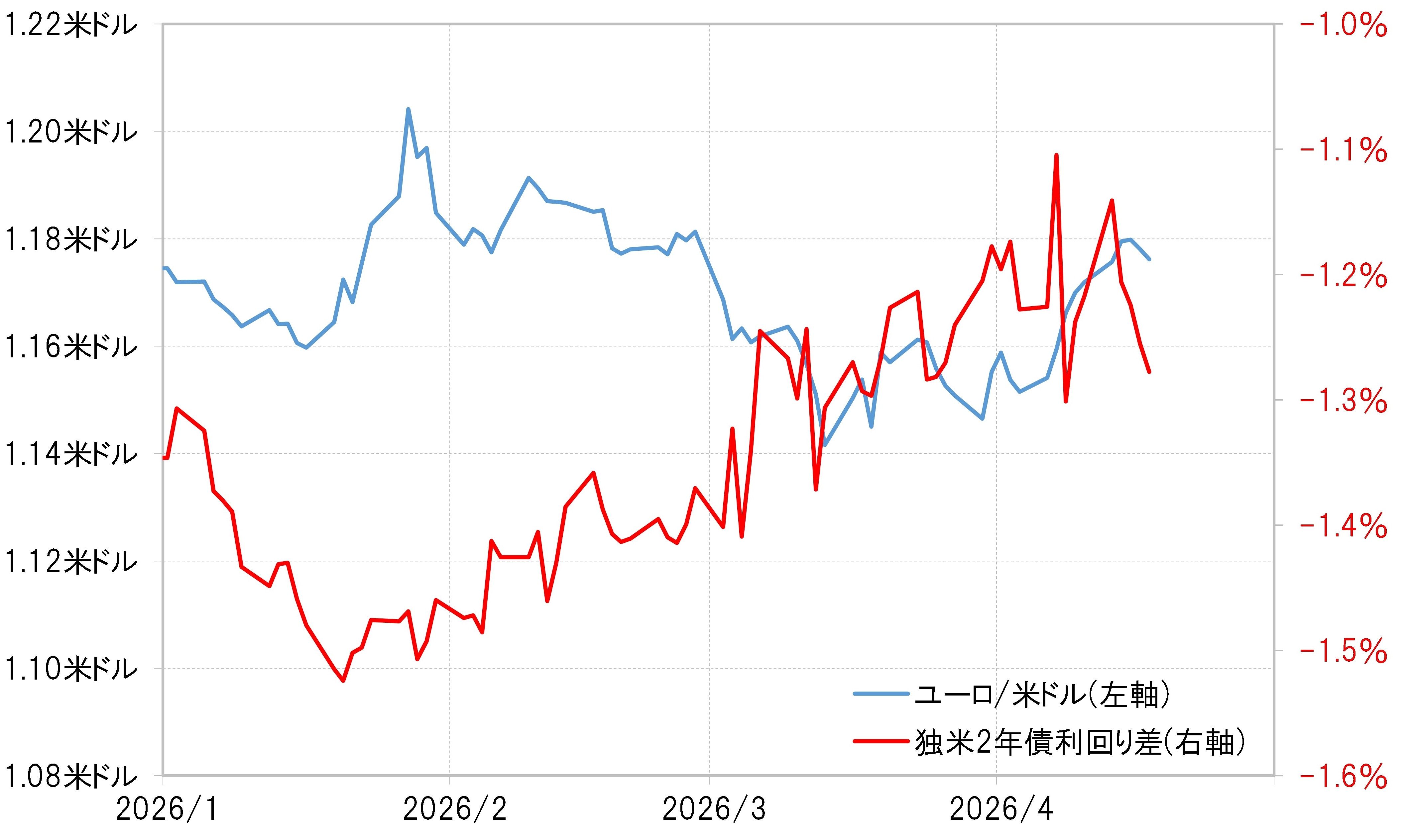 2月末のイラン攻撃開始前の水準までユーロ高・米ドル安に戻してきた動きは、米独金利差(ユーロ劣位・米ドル優位)縮小に追随したようにも見えました(図表5参照)。イラン攻撃開始後のユーロ安・米ドル高は、米独の金利差の縮小を尻目に展開した結果でもあったのですが、それが金利差の変化に素直に反応するようになったのはなぜでしょうか。