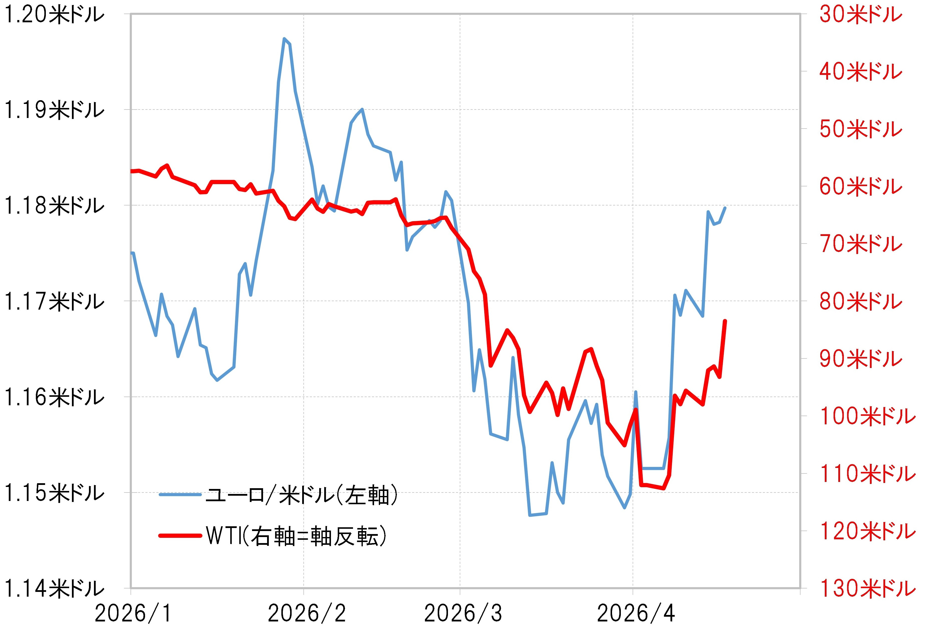 今回のイラン戦争における最も大きな影響とされるのがホルムズ海峡封鎖などによる原油などエネルギー供給不安でしょう。それをより素直に反映するのは原油などエネルギー価格の高騰です。そんなエネルギー価格は、上述のように4月17日にはホルムズ海峡通航の開放を受けてWTIは80米ドル台前半まで急落しました。しかし、イラン攻撃開始前には60米ドル台だったので、まだそれより高い水準での推移が続いています。そんな原油価格との関係でみると、ユーロ/米ドルなどはユーロ高・米ドル安に「戻り過ぎ」です(図表3参照)。