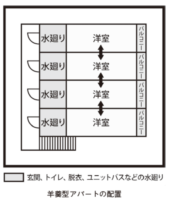 初めてセミナーにご参加いただいたお客様より質問された、羊羹型アパートについてお話し致します。羊羹型アパートとは、玄関を入るとまず水廻りがあり、その奥に居室があるという間取りのお部屋が、横並びに配置されているアパートのことです。外側から見ると、玄関ドアが横一列に等間隔に並んでいます。「アパート」と聞いて、みなさんがパッと思い浮かべるアパートのことです。