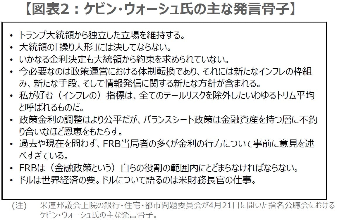 なお、FRBの次期議長に指名されたケビン・ウォーシュ元理事は4月21日、指名公聴会に臨みました。ウォーシュ氏の承認手続きがスムーズに進めば、5月15日に議長としての任期が満了するパウエル氏は、今回が議長として最後のFOMCとなります。ウォーシュ氏の指名公聴会における主な発言骨子は図表2の通りで、目先の金融政策については明言を避けたものの、FRBの改革などに触れており、今後の発言にいっそう注目が集まります。