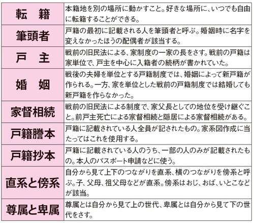 また、戸籍にはさまざまな専門用語があります。しかし、家系図を作成するために必要となる用語はそれほど多くはありません。下記の用語を覚えておけば十分です。
