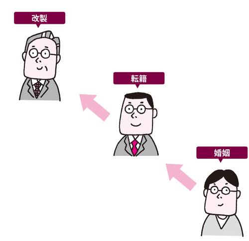 三つ目は改製です。法改正によって新しい様式の戸籍が作られます。これは個人の行動によるものではないので、ほとんどの人が気付かないうちに戸籍が新しくなります。
