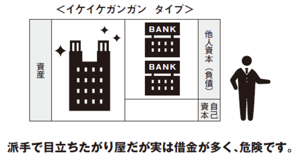 反対に、稼ぎが少ないわりに、見栄っ張りという会社なら、他人のお金(他人資本)が目立つのです。所有欲が強ければ、左側にやたら建物や土地が多いのです。