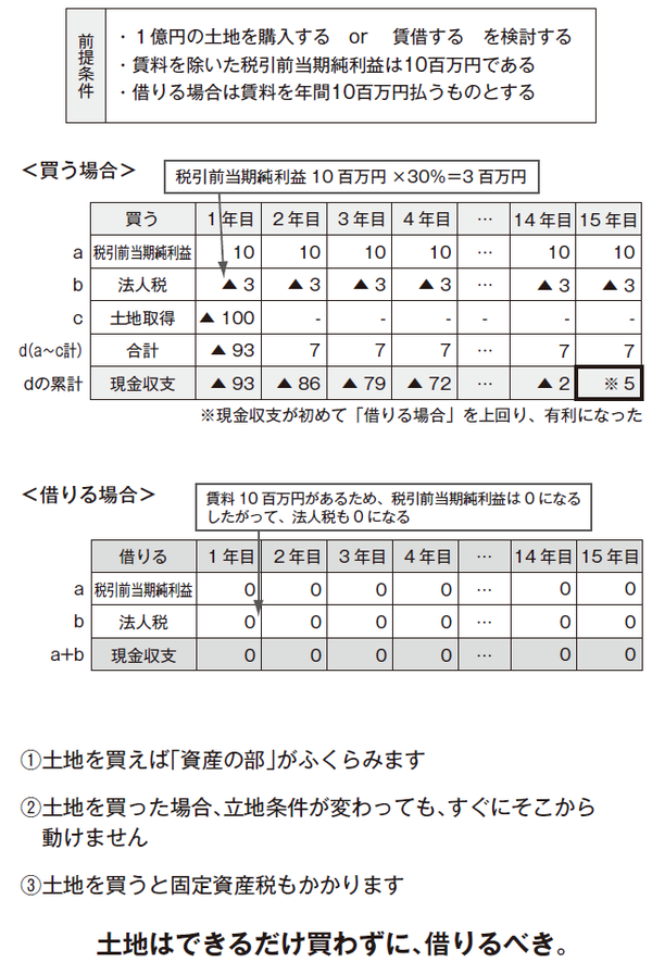 確かに、一見すると、もっともらしい考えです。しかし、土地は減価償却(50ページ※書籍参照)できないため、資産の部が膨らみます(①)。また立地条件は10年もたてば変わります(②)。固定資産税もかかってきます(③)。