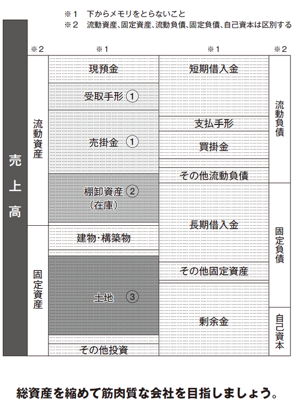 ぜい肉は売上債権(売掛金や受取手形)、在庫、土地につきやすくなります。売上債権なら月商の何カ月分、在庫なら毎月の売上原価の何カ月分かを計算してください。売掛金や受取手形が多ければ不良債権がないか、回収条件を変更できないかなどを検討してください。