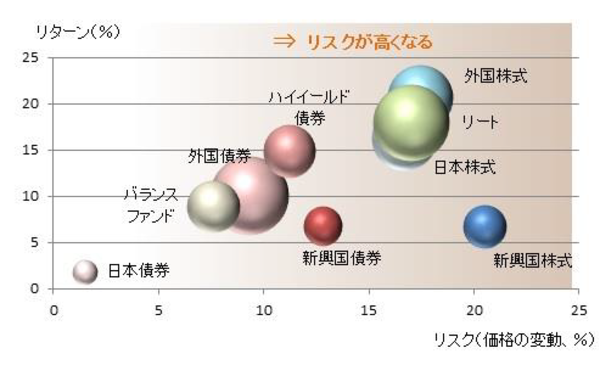 図表1は、円の大きさで公募販売されている投資信託の資産残高を示しています。縦軸はリターン、横軸には価格変動リスクの大きさを表しています。図の右側に位置しているリスクが高い資産は、残高構成が大きいことがみてとれます。