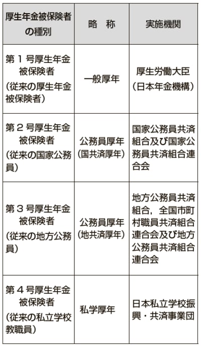 一元化後の厚生年金は、各共済組合からの移行者がいるために、4種類の被保険者種別(第1号~第4号)に分けて、区別をすることになりました。また、国民年金の被保険者種別(第1号~第3号)と混同しないように略称が付けられています。以下に、その区別等を一覧表で記します。