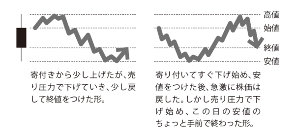 こうしたローソク足ができあがるには、株価の動きが必要です。上下にヒゲをつけた陽線・陰線は、形自体は、それぞれ一種しかないのですが、下記の図表2で示すように、実際には、株価はおよそ2通りの動きをします。
