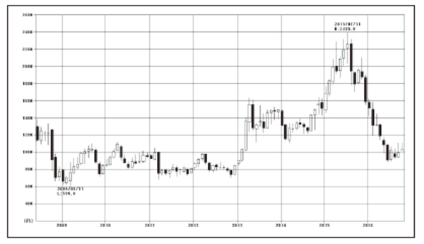 月足は、年に12本。銘柄の大局的な動きを見るにとどまる。1年にわたって、ほぼ12本の陽線を立てることがある。逆に12本の陰線を立てて、その1年買い向かった人は散々であった、という相場もある。こうした超長期なローソク足は、歴史的な高安の株価のときに、利用され、株価の大きな周期を把握するためや、時代の流れを読むために使われる。