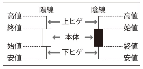 始値より終値が高いローソク足は「陽線(ようせん)」と呼ばれ、上昇相場を表します。反対に、始値より終値が安いローソク足は「陰線(いんせん)」と呼ばれ、下降相場を表します。