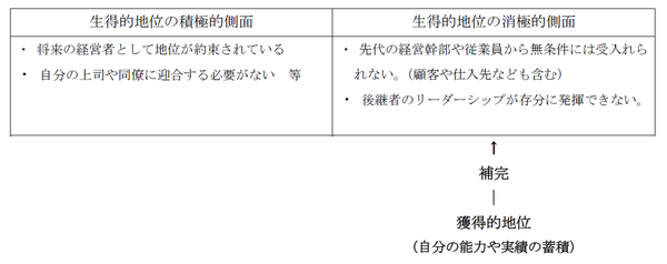 第一に、後継者が次期経営者に昇格するために必要な経営能力や経験の蓄積を促進させる効果です。前回取り上げた生得的地位とは、後継者が能力や実績がなくても、言い換えれば何の努力もせずとも、生来的に獲得していた地位のことでした。