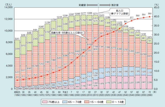 65歳以上の高齢者人口比率は、2015年で26.7%(3,392万人)と上昇を続けており、推計では、2035年で33.4%(3,740万人)、2060年で39.9%(3,464万人)となり、今後もさらに上昇する見通しです。