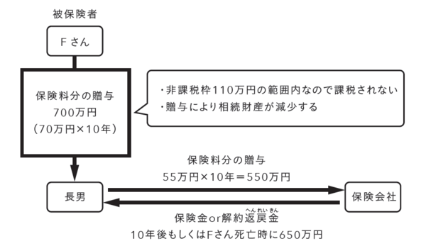 北井 保険料については毎年、暦年贈与で被相続人から贈与するのです。110万円の非課税枠内なら税金はかかりません。では、Fさんを被保険者とする死亡保険金650万円の生命保険契約を長男が結んだ場合にどうなるのか見てみましょう。