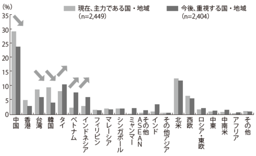 これを見ると、「現在、主力である国・地域」は、中国、北米、韓国、台湾、タイ、西欧、香港となっています。一方、「今後、重視する国・地域」は、中国、北米、タイ、ベトナム、インドネシア、台湾、西欧の順番になっています。