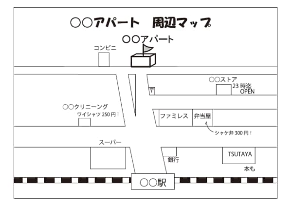 もうおわかりですね。大家であるあなたが教えてあげればいいのです。周辺マップを作って不動産業者に「物件を紹介するときに、これもお客さまに見せてください」と渡すだけです。ぜひやってみてください。また、空室内にカラーコピーしたものを置いておくのも良いでしょう。何枚かまとめて置いておき、「どうぞご自由にお持ち帰りください」としておけば手に取りやすくなります。
