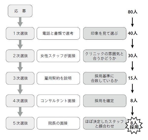 5次選抜は面通しのようなもので、これまで院長先生にノーといわれた例はほとんどありません。院長先生が選抜に悩む必要がないように絞り込むのが私たち経営コンサルタントの役割ですから、きちんと仕事ができている証左だと考えています。