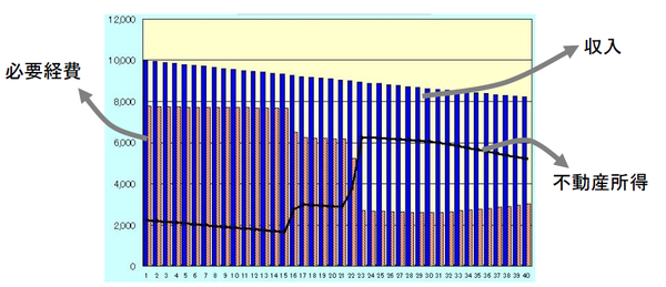 ところで、この事例は一つの物件の収支を計算・表示したに過ぎません。建築時期の違う複数の物件を所有していたり、建築時期が同じでも耐用年数が異なる物件を所有している場合にはこのような単純な推移にはなりません。