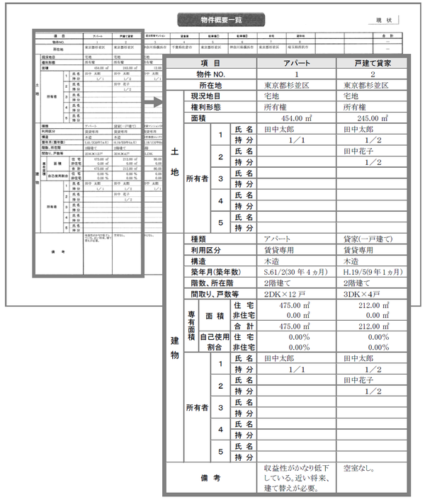 資料が入手できたら今度はエクセルで物件の一覧表を作成します。我々の事務所ではエクセルではありませんが、お客様毎に「物件概要一覧」として次のような帳票を作成しています。共有者がいる場合には各人の持分が一覧表示されますので便利です。