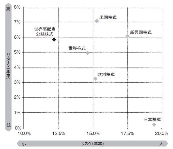 下記の図表1で、2006年から2016年までの、世界高配当公益株式のリスク・リターンを見てみます。前にも見たように、横軸がリスクで、右に行けば行くほどリスクが高い、すなわちこの期間の値動きが激しかったことを意味します。縦軸はリターンで、この期間に達成した過去の収益率を年率換算して示しています。