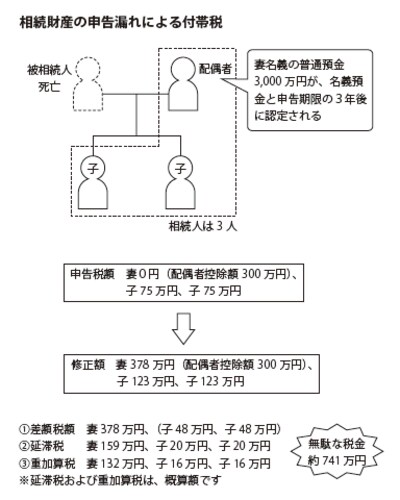 相続財産の申告漏れを指摘された場合、多額の付帯税が加算されるので注意が必要です。たとえば夫が死亡し、妻と子ども2人の計3人が相続人になったケースです。その際、相続財産の一部である3000万円を申告せずに妻が受け取り、銀行に定期預金として隠していました。ところが相続税の申告期限の3年後、その3000万円が名義預金として認定されてしまいました。