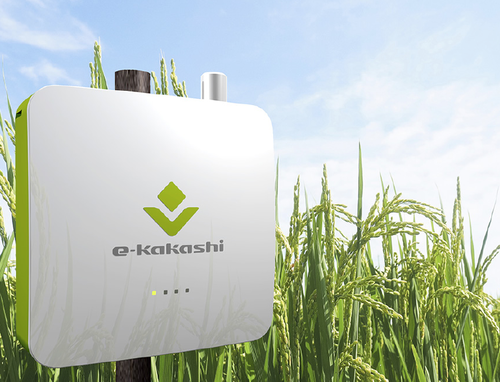 PSソリューションズの「e-kakashi」は、農場に設置することで生育環境データのリアルタイム収集、確認、分析ができる。ゲートウェイ(親機)とノード(子機)、iPad用アプリで構成されており、簡単に農業IoTを実践できる。