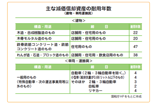 国は様々な物に対して法定耐用年数というものを定めています。たとえばマンションなど住居用の鉄筋コンクリート造(RC造)の建物は47年。普通自動車は4年。これは事業を行うに当たって必要な建物や高額な設備などの購入費を、一度に経費計上しないで何年かに分ける減価償却を行うための年数です。