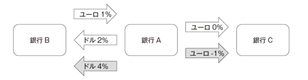 銀行Aはスワップにより3%(ドル4%-ユーロ1%)の利益を得るが、不要なユーロを確実に手放すために銀行Cに対してマイナス1%の金利を提示する。銀行Aは、銀行Cとの取引では1%の損をするが、銀行Bとは3%の利益が上がっているため、全体としては2%の利益を確保することができている。銀行Cはマイナス1%で手に入れた資金をマイナス0.6%で他の銀行に貸し出せば、銀行Cは0.4%(マイナス0.6%-マイナス1%)の利益を得ることができ、マイナス金利がより広い範囲に広がることになる。