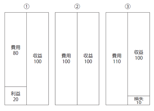 たとえば、①のように、収益より費用が小さく、利益が出ている状態であれば問題ありません。②のトントン状態ぐらいならまだOKですが、③のように、収入より費用が膨らむと、損失が出てくることになります。「これは雲行きが怪しいぞ」と判断できるわけです。
