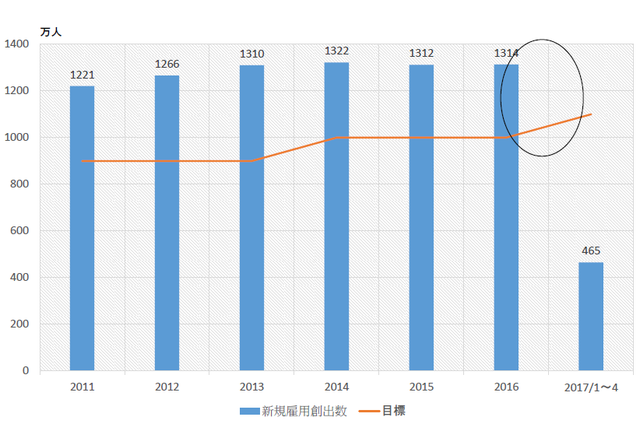 もちろん、目標引き上げの背後には、①経済規模自体が大きくなっており、1%の成長で創出される付加価値は以前よりはるかに大きく、したがってそれによって創出される雇用が以前より増加していること、また、②近年、実績が目標を常に大きく超えていることから、6.5%程度の成長でも十分1100万人の雇用創出は可能との判断がある(17年1〜4月の新規雇用創出実績は465万人、すでに目標の42.3%を達成)。