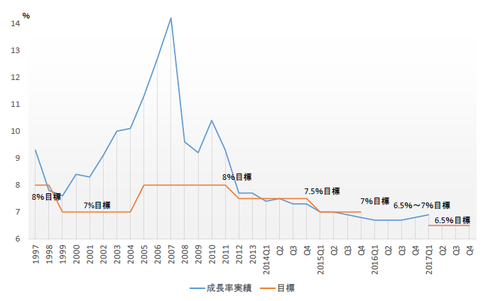 第2に、グローバル金融危機の後、2009〜16年、段階的に成長率目標は引き下げられてきたが(いわゆる「保八」、8%成長を死守するという政策の終焉)、これは明らかに実際の成長率鈍化に合わせ、受動的に目標が引き下げられてきたものだ。しかし、16年は目標を達成し、特に年後半からは景気が上向く兆しも見られた(16年第1〜3四半期が6.7%成長、第4四半期6.8%、17年第1四半期6.9%、31省市区別に見ると、全国成長率6.9%を上回った地区は22、また各々の年目標率を達成した地区は23)。
