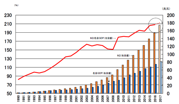 ただ、17年成長率目標6.5%、物価上昇率目標3%以内を前提に名目成長率を仮に9.5%とし、M2伸びを目標値の12%としてM2の対GDP比を計算すると、17年213%にまで上昇することになる。同比率の歴史的推移を見ると、1990年代半ばに100%を超える転換点を迎えた後、ほぼ一貫して急上昇し、2000年代初めに150%、15年に200%を突破し、その膨張ぶりは「貨幣超発」と称されてきた(下記図表)。